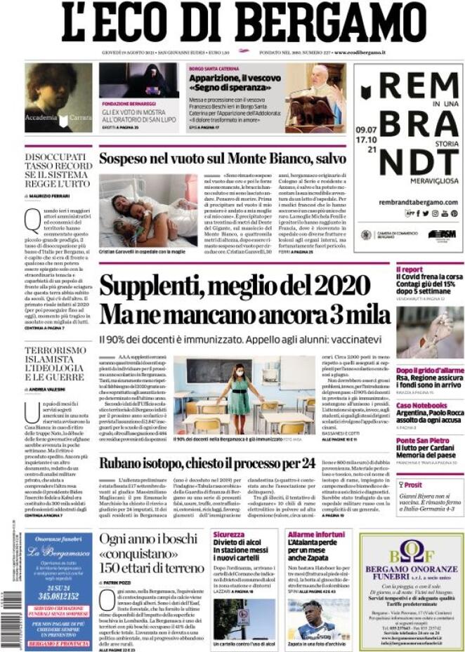 L'Eco di Bergamo nella sua edizione odierna lancia l'allarme infortuni in casa Atalanta: "L'Atalanta perde per un mese anche Zapata" titola il quotidiano in prima pagina. Un'altra tegola non da poco per la Dea. Sabato sera conto il Torino non ci saranno anche i lungodegenti Hateboer per un problema al piede, Malinovskyi a causa di un’ernia addominale e Lammers operato alla spalla. Per squalifica saranno assenti Toloi, de Roon e Freuler.