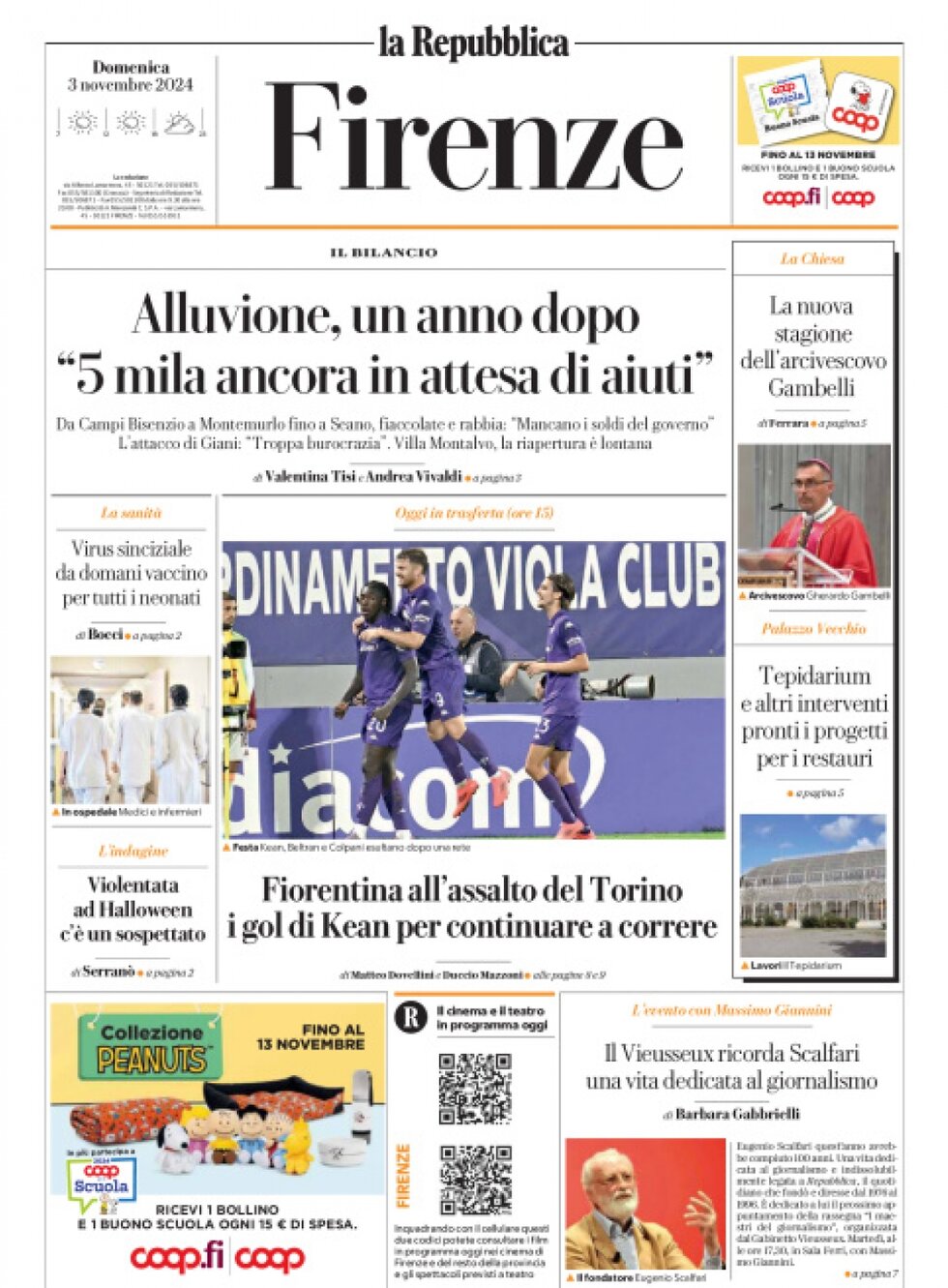 "Fiorentina all'assalto del Torino, i gol de Kean per continuare a correre". Così la prima pagina di oggi dell'edizione di Firenze di Repubblica ha scelto di titolare riguardo alla giornata calcistica.
