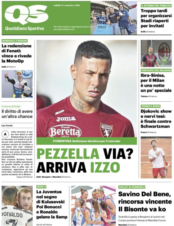 "Pezzella via? Arriva Izzo". Questo il titolo di apertura della prima pagina della sezione sportiva de La Nazione questa mattina sulla Fiorentina. Settimana decisiva per il mercato: manovre in difesa con i granata a cui piace Igor. La pista Bonifazi sempre calda. L'assenza - si legge - del capitano all'esordio in campionato può essere un segnale: in ogni caso è pronto Izzo a sostituirlo.