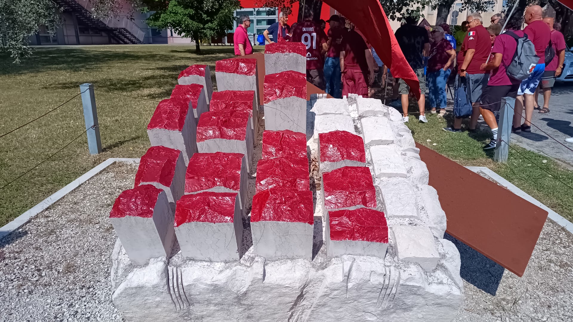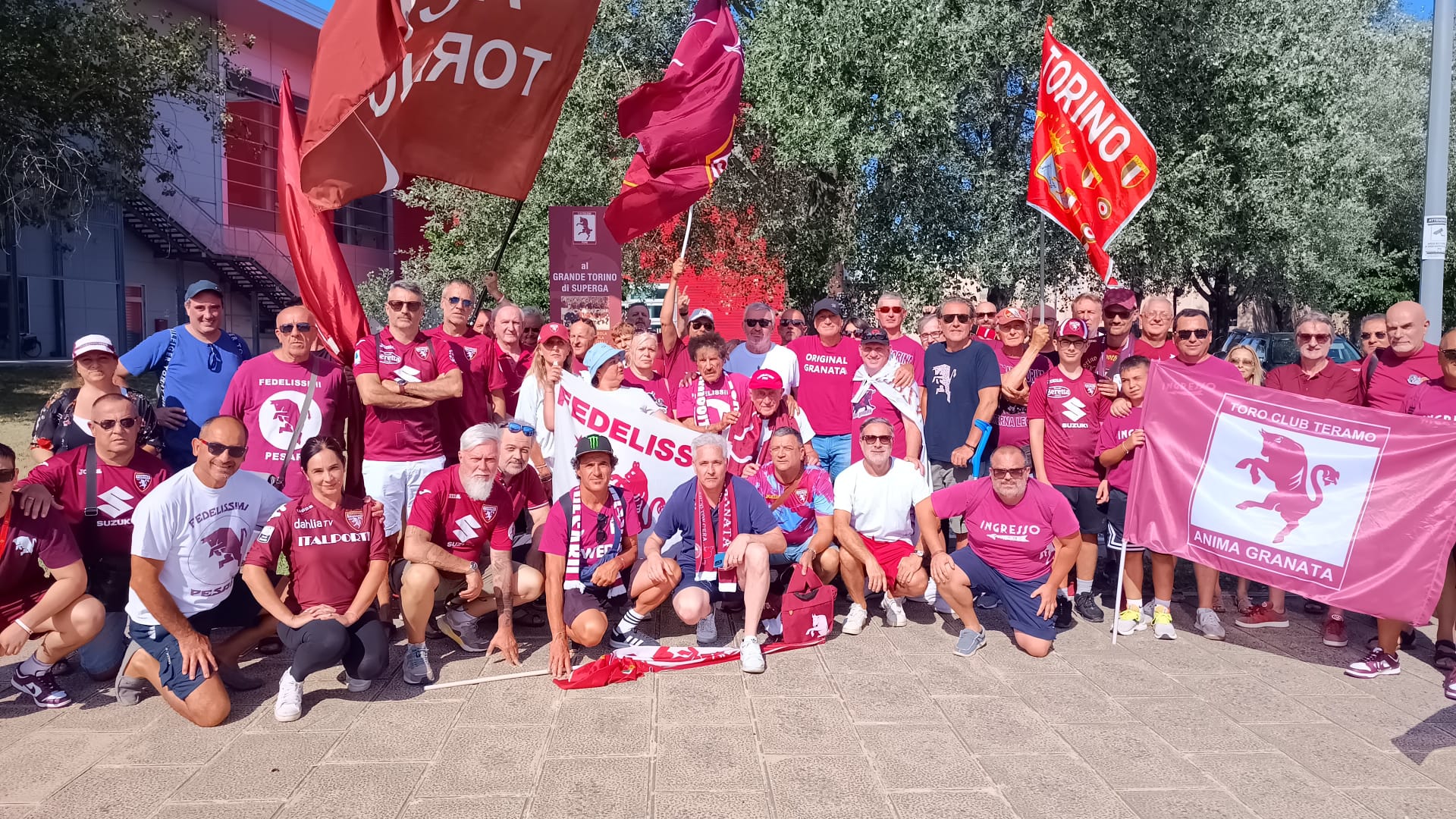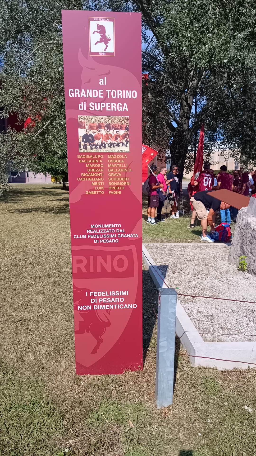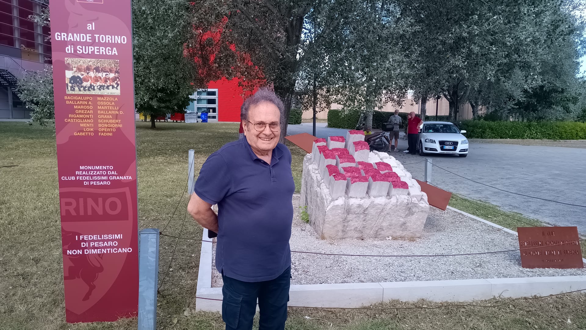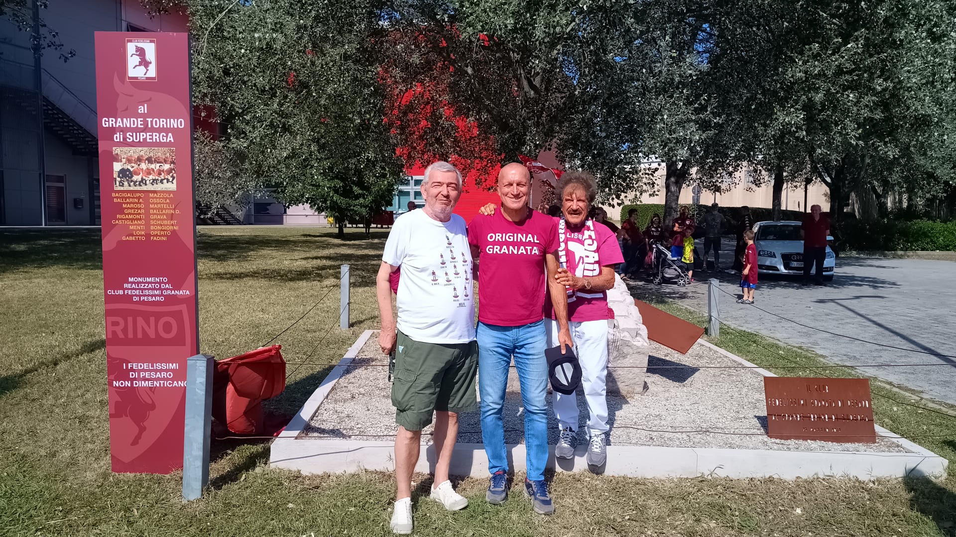 Si sta svolgendo questo pomeriggio a Pesaro la quarta edizione del Raduno Granata. In Piazza Marcello Stefanini dove si trova il monumento ai caduti a Superga realizzato gratuitamente dall'architetto Leone Podrini si è tenuta poi la commemorazione del Grande Torino. Tra gli ospiti dell'evento anche l'ex calciatore del Torino Pasquale Bruno. L'organizzatore del Raduno Granata, Mario Patrignani, ha parlato di questo monumento e di come è nato: "L'architetto Leone Podrini, mosso dal sentimento e dalla passione per il Grande Torino, ha realizzato un blocco di marmo dal quale escono undici parallelepipedi granata, che rappresentano i giocatori del Grande Torino, mentre dietro c'è un'ala che rappresenta l'ala dell'aereo che li ha uccisi ma li ha lanciati verso il mito. A fianco del monumento c'è la lapide che ne spiega il significato con tutti i nomi dei calciatori". Durante la cerimonia lo youtuber Davide dei Senzagiacca ha letto i nomi sulla lapide per commemorare i caduti della tragedia di Superga e per ricordare gli Invincibili, di seguito il video e alcune foto.