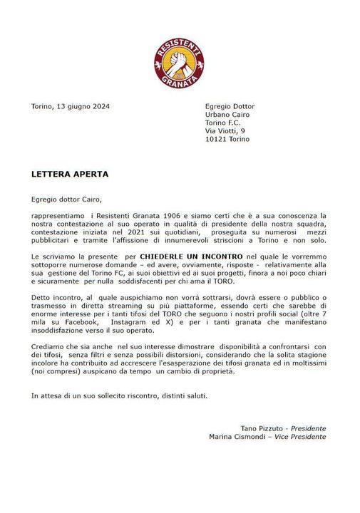 Tre giorni fa il gruppo di tifosi Resistenti Granata 1906 ha inviato una lettera aperta al presidente del Torino Fc Urbano Cairo nella quale chiedono un incontro pubblico al patron della loro squadra relativo alla gestione, agli obiettivi e ai progetti che ha per il club perché sono scontenti del suo operato.