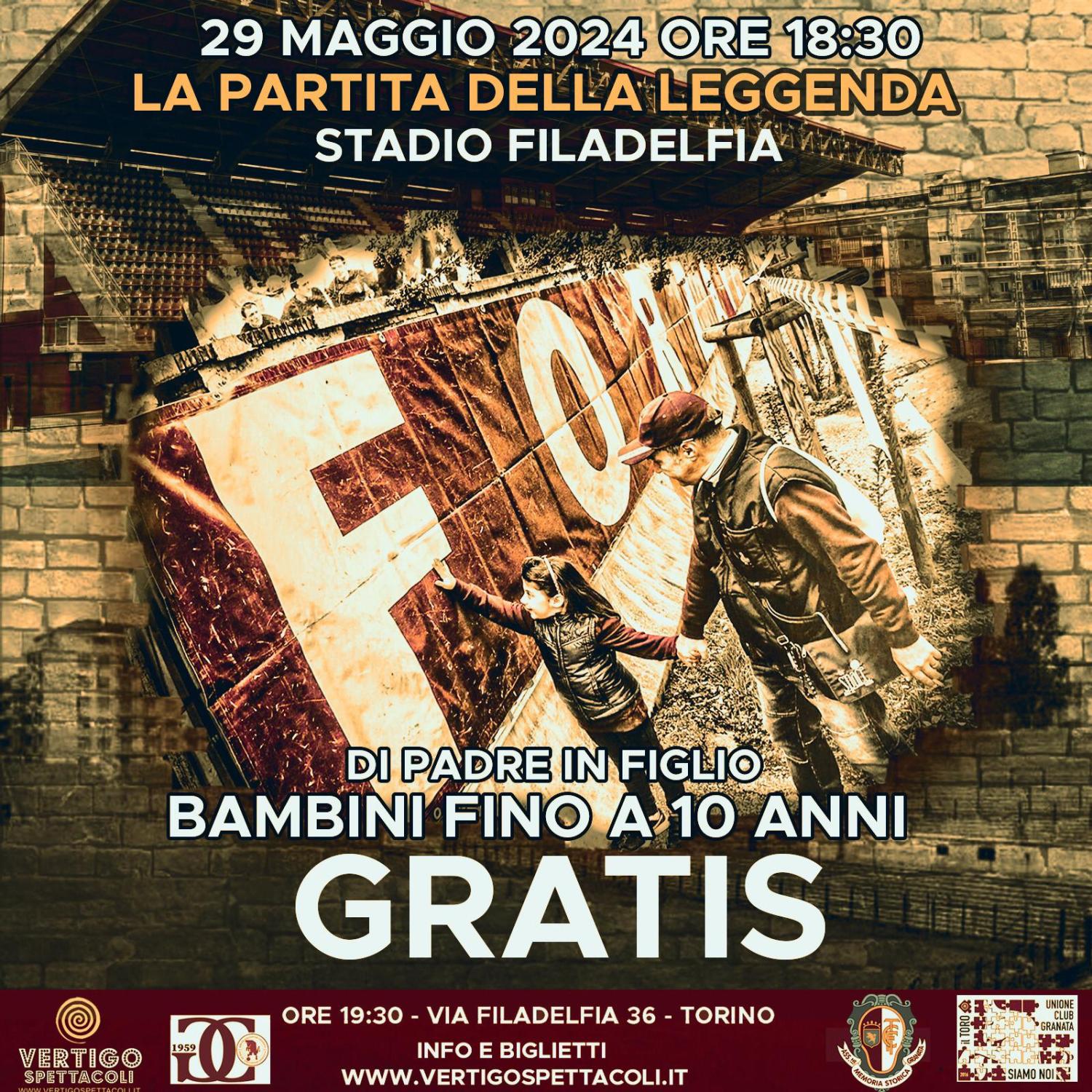 All’insegna dello slogan che la passione si tramanda “DI PADRE IN FIGLIO” i bambini fino a 10 anni entreranno gratis alla “Partita della Leggenda” che si giocherà mercoledì 29 maggio alle ore 18,30 dove scenderanno in campo Glorie Granata e gli Artisti & Amici Granata per raccogliere fondi per la realizzazione della sede del Museo del Grande Torino e della Leggenda Granata al Fila.