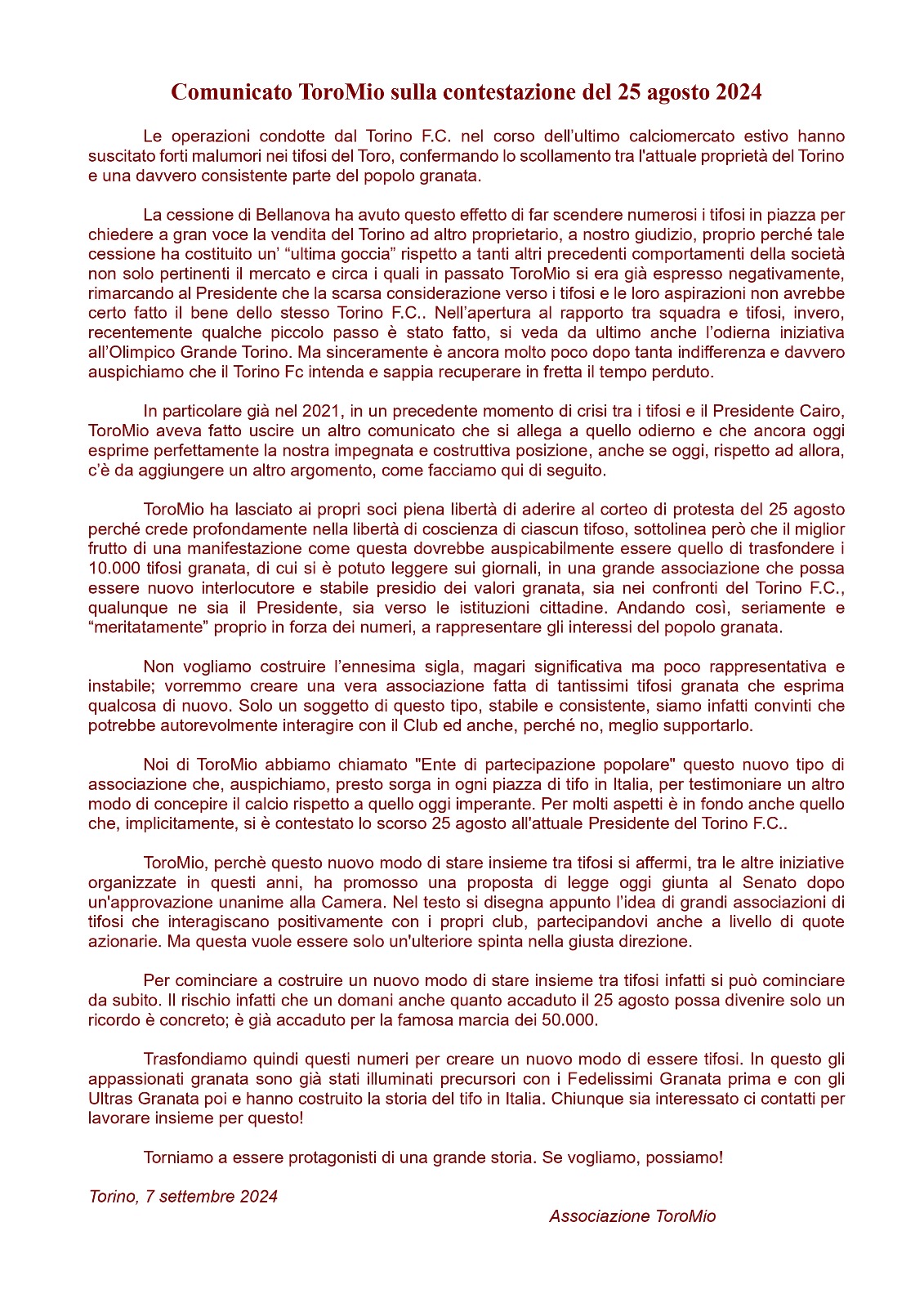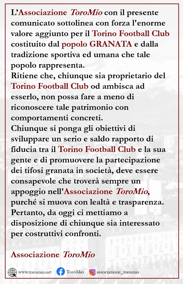 “L’Associazione ToroMio con il presente comunicato sottolinea con forza l’enorme valore aggiunto per il Torino Football Club costituito dal popolo GRANATA e dalla tradizione sportiva ed umana che tale popolo rappresenta.
