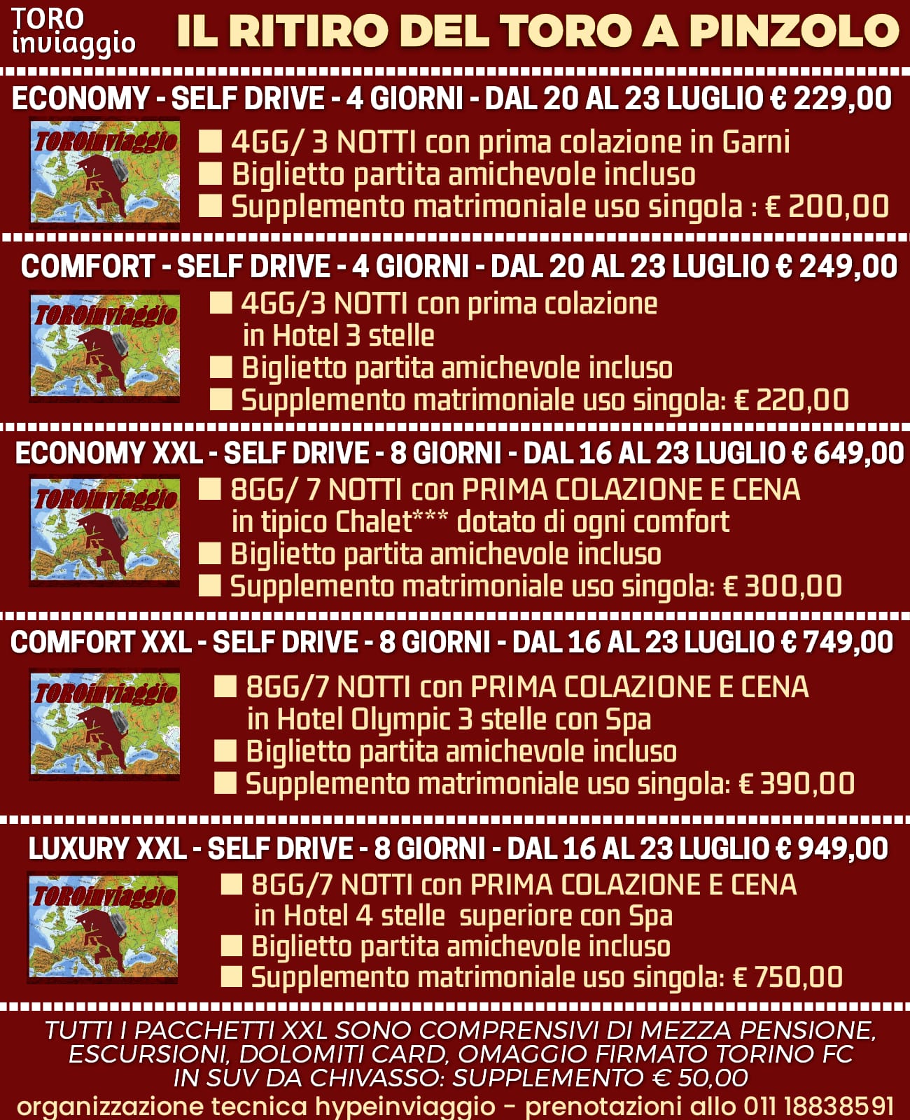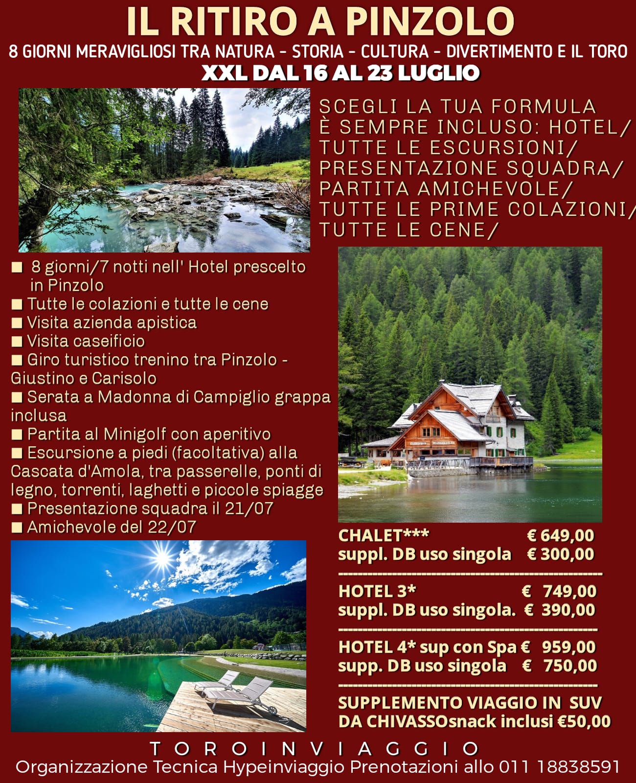 Il Torino sarà a Pinzolo, nell'alta Val Rendena, in Trentino Alto Adige dal 17 al 28 luglio per preparare la stagione ecco i pacchetti per i tifosi proposti da Toroinviaggio per seguire la squadra di Juric e avere l’occasione anche di fare una vacanza fra natura, storia, cultura e divertimento in una bellissima zona d’Italia: