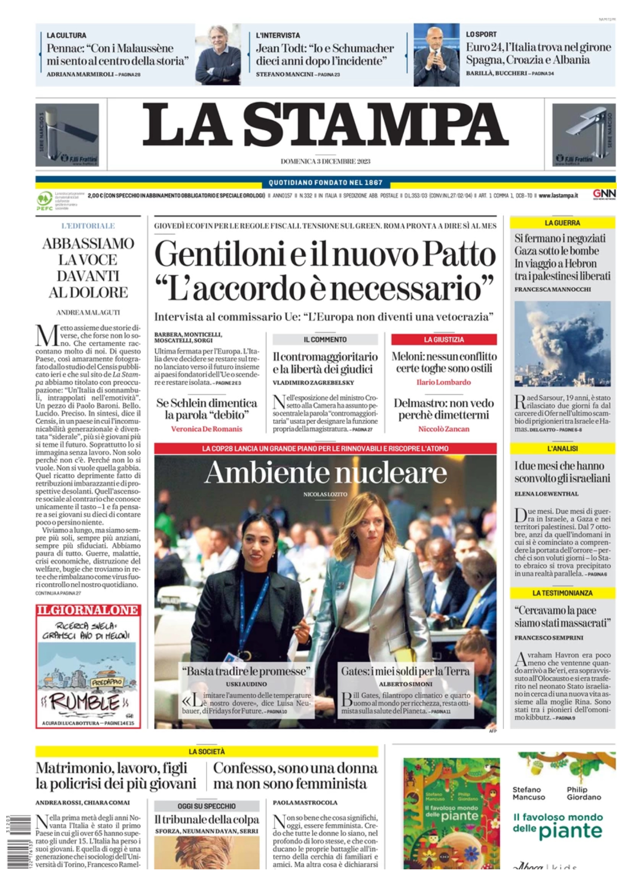 "Si sfida la meglio gioventù", si legge sulle pagine de La Stampa in edicola oggi. Il titolo è dedicato alla sfida di domani tra Torino e Atalanta che chiuderà la giornata di Serie A: Alessandro Buongiorno, diventato un simbolo granata dopo aver rifiutato proprio i nerazzurri in estate, battaglierà contro Gianluca Scamacca, bomber atalantino in gol contro lo Sporting: "Con vista anche sull'Europeo", ribadisce il quotidiano. L'obiettivo è convincere anche il ct Luciano Spalletti in vista della rassegna continentale che partirà a giugno in Germania.