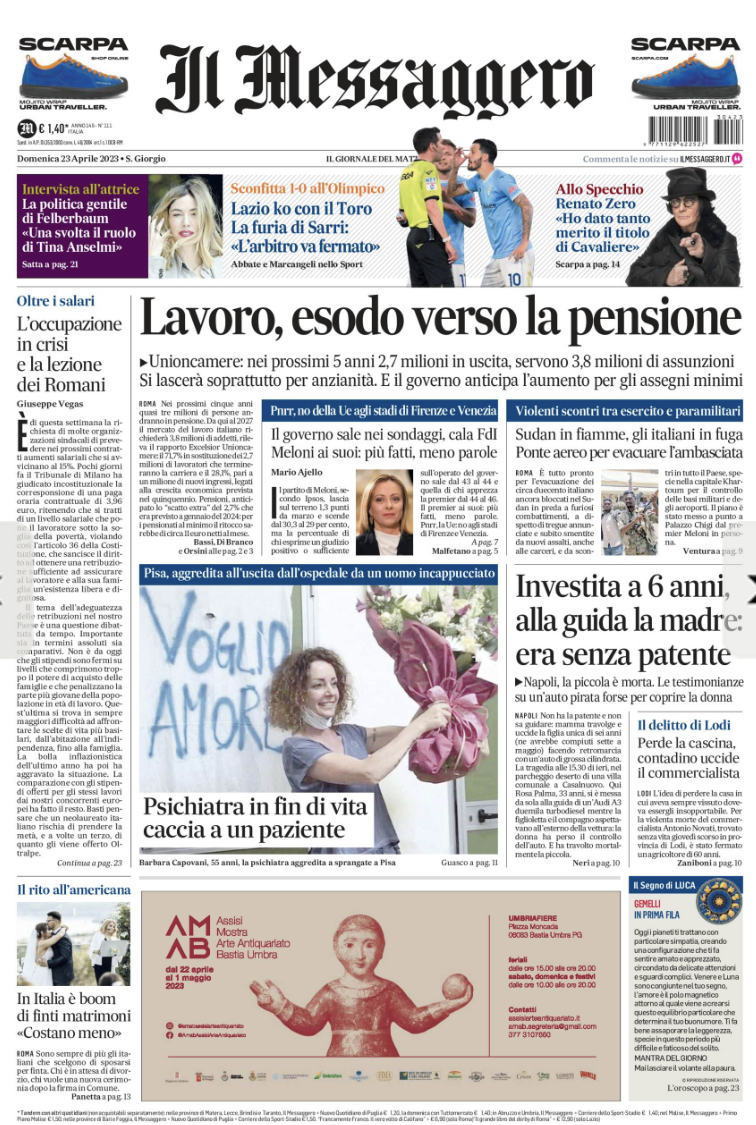 "Lazio incornata dal Toro". Questo il titolo con cui l'edizione odierna de Il Messaggero apre la pagina sportiva. Sconfitta casalinga per la Lazio di Maurizio Sarri che vengono battuti 1-0 dal Torino. Battuta d'arresto importante in chiave secondo posto in vista soprattutto della sfida di questa sera fra Juventus e Napoli.