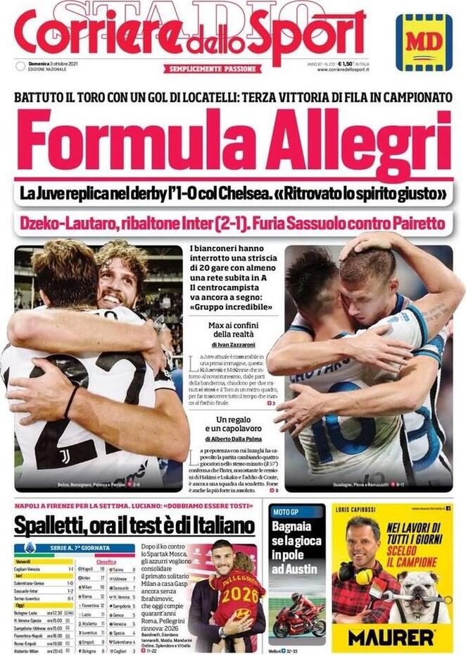 La Juventus si aggiudica il derby di Torino grazie ad una rete di Manuel Locatelli nel secondo tempo: è la terza vittoria i di fila in campionato. Il Corriere dello Sport oggi in edicola titola così: "Formula Allegri". I bianconeri interrompono una striscia di venti gare con almeno una rete subita in Serie A.