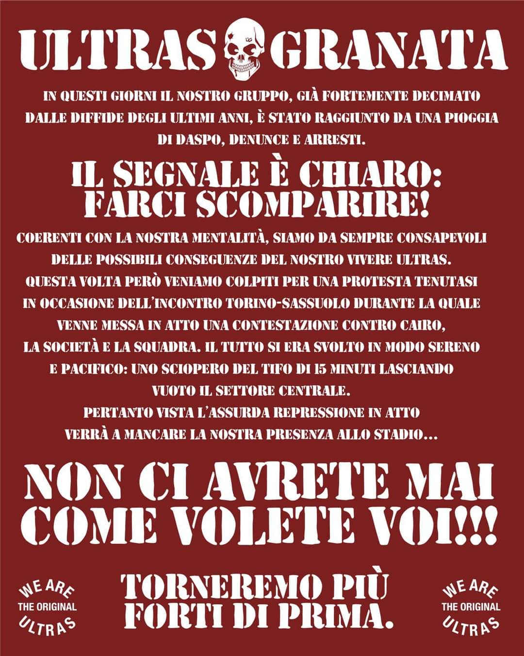 Ecco il comunicato, riportato da Tuttosport, divulgato ieri sera degli Ultras Granata: “In questi giorni il nostro gruppo, già fortemente decimato dalle diffide degli ultimi anni, è stato raggiunto da una pioggia di daspo (una quindicina, ndr), denunce e arresti. Il segnale è chiaro: farci scomparire! Coerenti con la nostra mentalità, siamo da sempre consapevoli delle possibili conseguenze del nostro vivere Ultras. Questa volta però veniamo colpiti per una protesta tenutasi in occasione dell’incontro Torino-Sassuolo (6 novembre, ndr) durante il quale venne messa in atto una contestazione contro Cairo, la società e la squadra. Il tutto si era svolto in modo sereno e pacifico: uno sciopero del tifo di 15 minuti lasciando vuoto il settore centrale (secondo le forze dell’ordine si svilupparono anche alcune minacce per dar vita al “picchetto” del tifo e lasciare vuota quella parte centrale della curva, delimitata da nastri colorati; ndr). Pertanto verso l’assurda repressione in atto verrà a mancare la nostra presenza allo stadio... Non ci avrete mai come volete voi! Torneremo più forti di prima!”