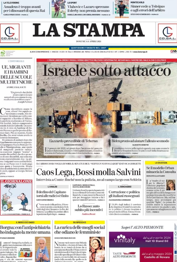 La Stampa nel taglio alto della prima pagina affronta la tematica relativa alla partita di ieri tra Torino e Juventus, terminata 0-0. Il quotidiano titola così: "Vlahovic e Lazaro sprecano. Il derby non premia nessuno". Il serbo nel primo tempo grazia Milinkovic-Savic cogliendo il palo da posizione molto favorevole e dopo si fa murare proprio dall'estremo difensore granata. Sul finale grave errore dell'ex Inter, che di testa non inquadra la porta e non regala i 3 punti alla squadra di Juric.