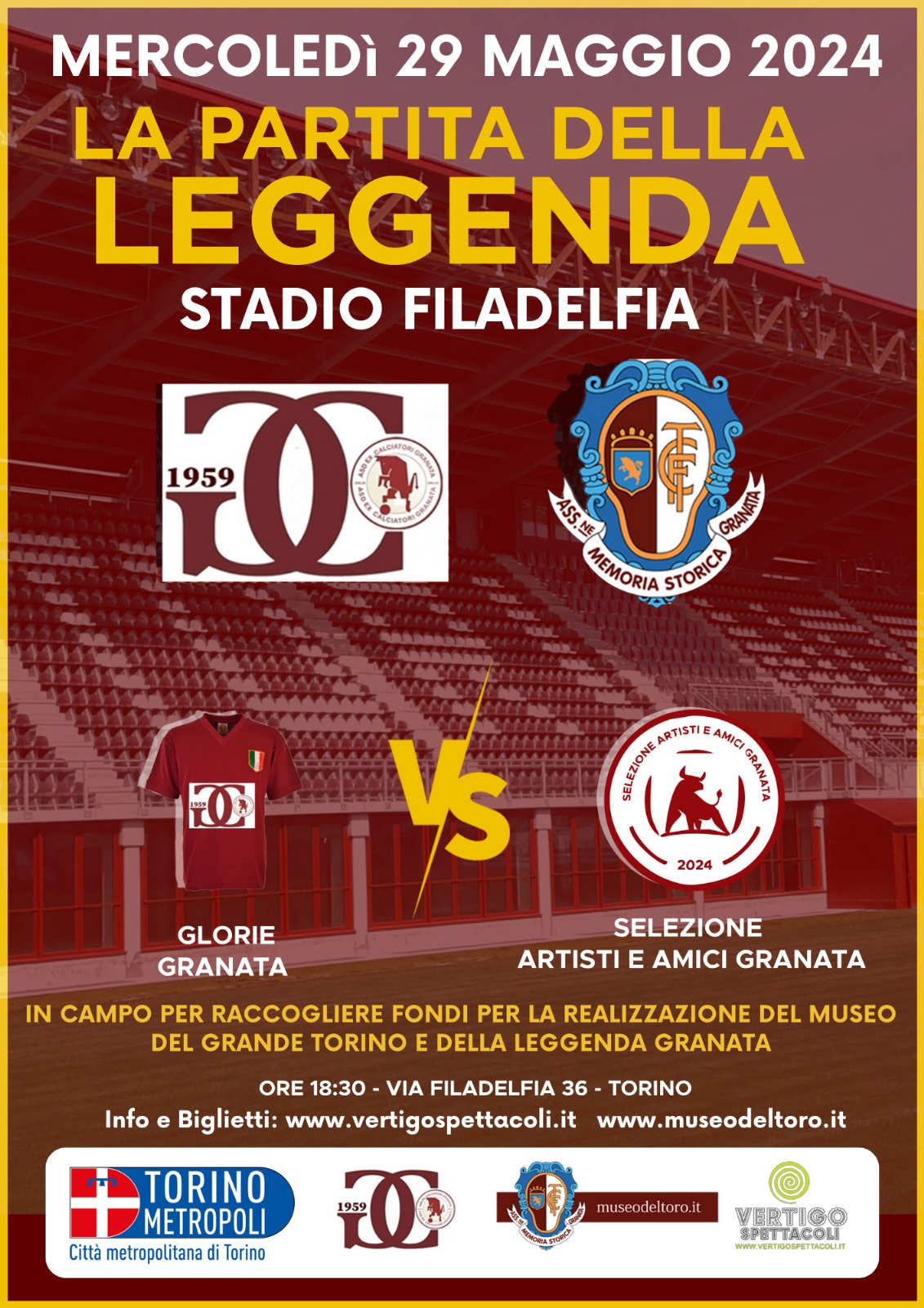 A chiamare a raccolta i tifosi granata è Pasquale Bruno. L’occasione è “La Partita della Leggenda” che vedrà sul terreno del Filadelfia affrontarsi le Glorie Granata e gli Artisti & Amici Granata rispettivamente allenati da Claudio Sala e Pasquale Bruno. La gara si disputerà mercoledì 29 maggio con fischio d’inizio alle ore 18,30. Lo scopo è raccogliere fondi per costruire la sede del Museo del Grande Torino e della Leggenda Granata al Fila, come era stato stabilito quando fu ricostruito l’impianto sportivo ma non ancora fatto per la pare, il 3° lotto, che è appunto destinato al museo. Attualmente il Museo del Toro, è gestito esclusivamente dai volontari dell’Associazione Memoria Storica Granata, si trova a villa Claretta Assandri in via G.B. La Salle 87 a Grugliasco, comune in provincia di Torino.