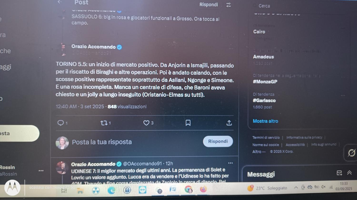 Orazio Accomando, giornalista telecronista di Dazn, ha stilato, sul proprio profilo X, le pagelle relative al mercato appena concluso dei club di Serie A. del Torino ha scritto: “Un inizio di mercato positivo. Da Anjorin a Ismajili, passando per il riscatto di Biraghi e altre operazioni. Poi è andato calando, con le scosse positive rappresentate soprattutto da Asllani, Ngonge e Simeone. E una rosa incompleta. Manca un centrale di difesa, che Baroni aveva chiesto e un jolly a lungo inseguito (Oristanio-Elmas su tutti)”. E quindi ha dato come voto 5,5.