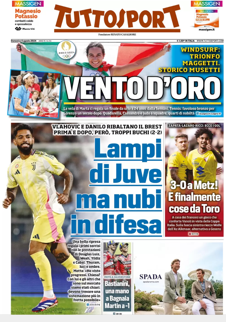 A casa dei francesi del Metz un gioco che conforta Vanoli in vista della Coppa Italia. Come con la Cremonese il colombiano ha segnato e hanno poi arrotondato Lazaro e Ricci. E c’è stata intesa fra Adams e Zapata. Prova convincente con circolazione di palla rapida e occasioni da gol: la strada è giusta, ma Vanoli è da sostenere sul mercato con i rinforzi in vista dell’inizio di stagione. La doppia uscita tra Lione e Metz si è chiusa con tre gol fatti e nessuno preso un buon viatico in vista della Coppa Italia con il Cosenza. E il quotidiano Tuttosport in prima pagina titola: “3-0 a Metz! E finalmente cose da Toro”.