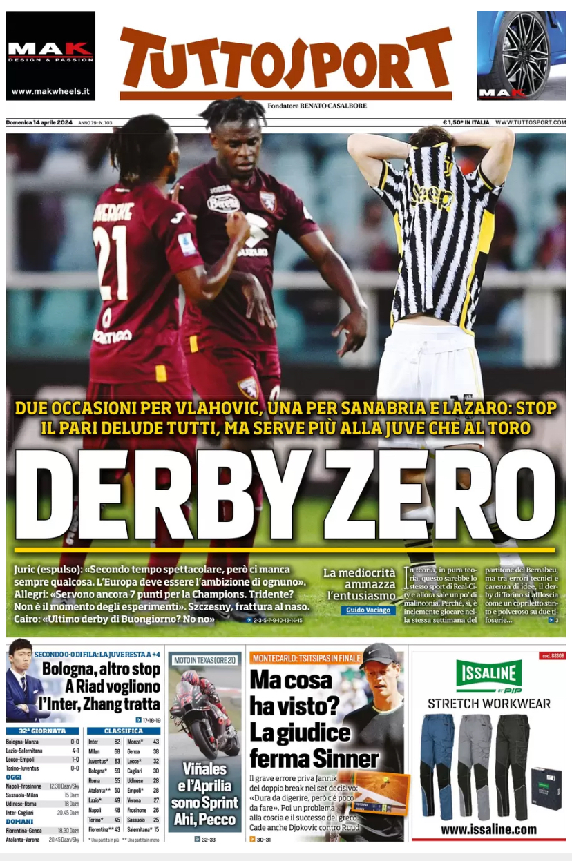 Due occasioni per Vlahovic, un palo e una paratona di Vanja, una per Sanabria, Szczesny dice no al suo tiro ravvicinato, e Lazaro, nel finale (94’) spreca di testa: stop. Il pari delude tutti, ma serve più alla Juve che al Toro. E il quotidiano Tuttosport in prima pagina titola: “Derby zero”.