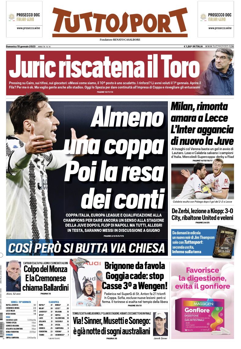 Juric in pressing su Cairo, sui tifosi, sui giocatori: “Messi come siamo, il 10° posto è uno scudetto. I rinforzi? Li avrei voluti il 1° gennaio. Aprire il Fila? Per me è ok. Ma voglio gente anche allo stadio”. Oggi lo Spezia per dare continuità all’impresa di Coppa e risvegliare gli entusiasmi e il quotidiano Tuttosport in prima pagina titola: “Juric riscatena il Toro”.