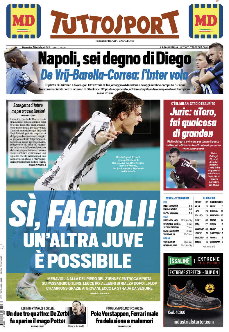 Al Grande Torino questa sera c’è il Milan e lo stadio è esaurito. Pioli obbligato a vincere per tenere il passo del Napoli, ma il Torino “è pronto per una grande gara” come ha detto Juric e il quotidiano tutto sport in prima pagina titola: “Juric: «Toro, fai qualcosa di grande»”.