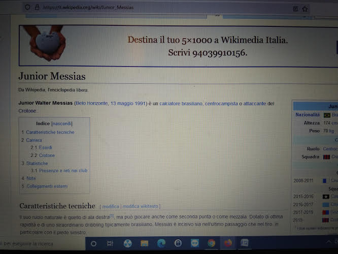 Questa mattina digitando sui motori di ricerca Junior Messias su Wikipedia si poteva leggere che è un giocatore del Torino …. ma al 50%. Già perché nella prima schermata guardando a destra Wikipedia lo indicava granata, poi aprendo la pagina era regolarmente scritto che è un giocatore del Crotone, come da foto in fondo all’articolo.