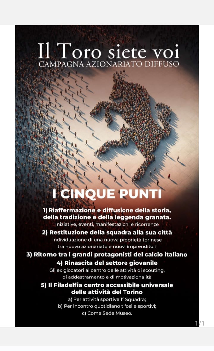 “Sono fermamente convinto che nella nostra città, nella nostra provincia, nella nostra regione, ci siano le risorse e i personaggi che possano realizzare i 5 punti della “Rinascita Granata” e far rinascere il Torino realizzandoli.