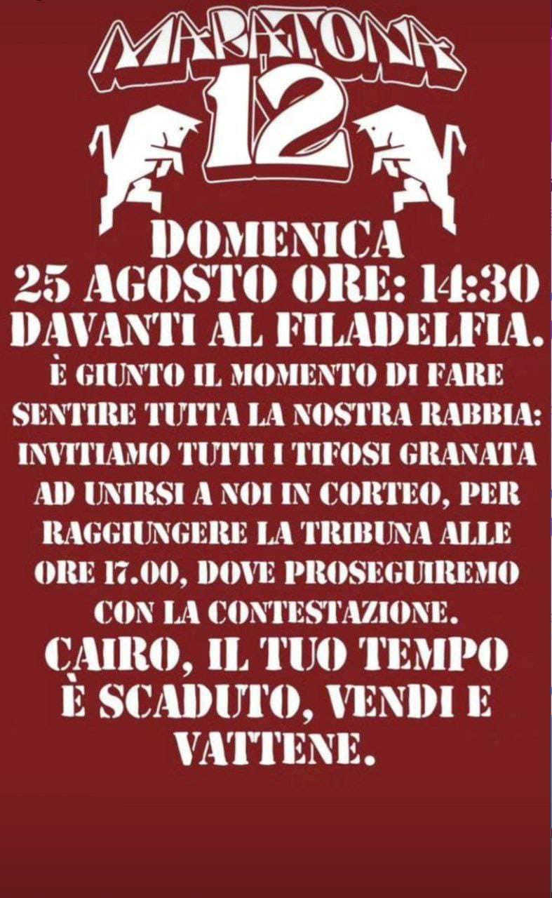 I commenti sui social sono per lo più irripetibili, ma oltre alle proteste e alle contestazioni “virtuali” i tifosi si stanno organizzando anche per atti concreti. La tifoseria organizzata “Maratona 12” per domenica, in occasione della gara con l’Atalanta, ha chiamato a raccolta tutti alle 14,30 davanti al Filadelfia: “E’ giunto il momento di fare sentire tutta la nostra rabbia invitiamo tutti i tifosi granata ad unirsi a noi in corteo, per raggiungere la tribuna alle ore 17, dove proseguiremo con la contestazione.