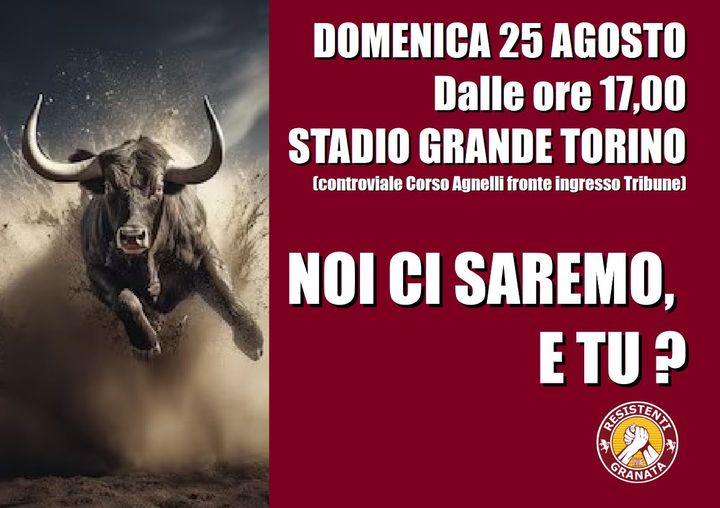 I “Resistenti granata”, sempre per domenica 25, invitano i tifosi alle ore 17 allo stadio Grande Torino, controviale corso Agnelli fronte ingresso Tribune, per manifestare il proprio dissenso all’insegna dello slogan “Noi ci saremo, e tu?” e sottolineano “Non è una manifestazione dei Resistenti Granata. E' la manifestazione di tutti i granata che amano il Toro e non possono più accettare di essere umiliati, ridicolizzati, raggirati, daspati, snaturati.