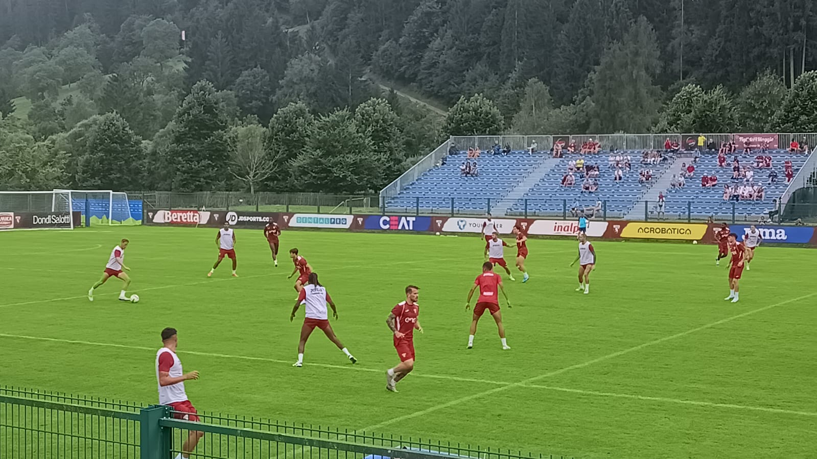 Martello Vanoli. Lo si scrive in senso assolutamente buono: mister Vanoli è un vero martello. Pretende tanto dai suoi giocatori ed è instancabile non solo nelle spiegazioni, ma anche nell’incitare, nel correggere, nel suggerire e nel riprendere quando serve. “Continua, non sbagliare, divertiti”, “Lo stop e un dribbling”, “Ritmo, ritmo, la palla corre”, “Usa l’interno, destro-sinistro”, “Qualità, qualità”, “Tieni alto il ritmo”, “Anche quando la voglio tenere (la palla, ndr) passaggi forti”: alcune delle frasi pronunciate dal mister durante le esercitazioni sui passaggi e il possesso palla nello stretto. E poi durante la fase tattica nelle partitelle: “Velocità”, “Non passaggi orizzontali”, “Qualche volta faccio passare …. lui si abbassa … e porto fuori: movimento”, “Gioca, gioca, continuità: questo è il ritmo quando voglio muovere la palla”. E i tifosi presenti a Pinzolo apprezzano e lo applaudono.
