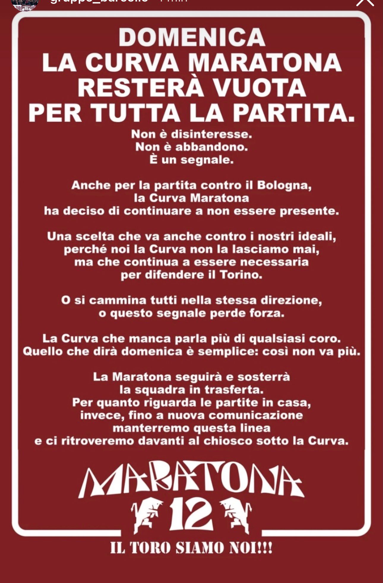 Per quanto riguarda le partite in casa, invece, fino a nuova comunicazione manterremo questa linea e ci ritroveremo davanti al chiosco sotto la Curva. Maratona 12, il Toro siamo noi!!!”.